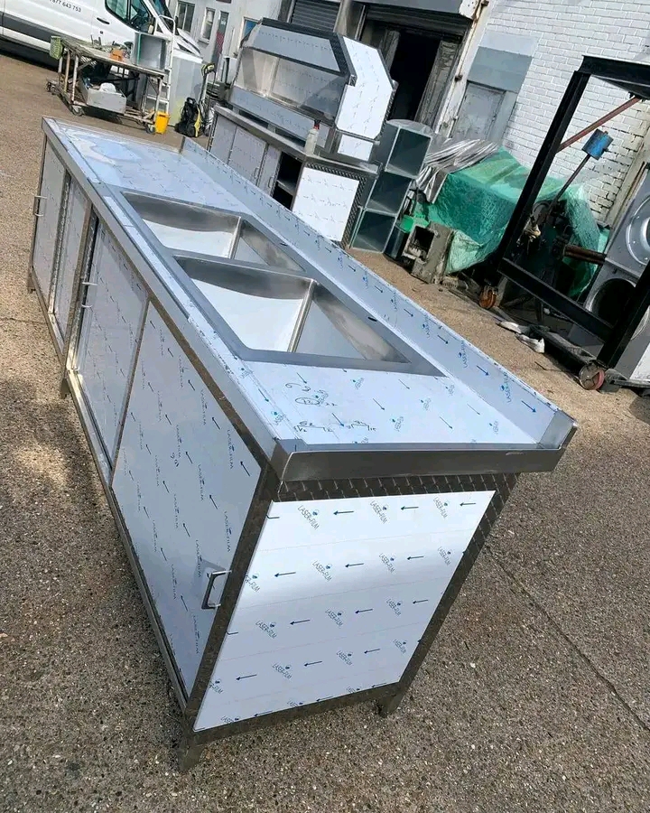 A double sink with storage cabinet is a stainless steel kitchen unit that features two washing bowls integrated with a closed cabinet beneath. The double bowls allow simultaneous washing, rinsing, or separation of tasks. The lower cabinet provides secure storage for cleaning supplies, utensils, or kitchen tools.